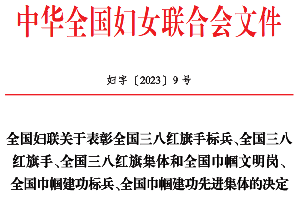 近日,中华全国妇女联合会印发《全国妇联关于表彰全国三八红旗手标兵、全国三八红旗手、全国三八红旗集体和全国巾帼文明岗、全国巾帼建功标兵、全国巾帼建功先进集体的决定》(妇字〔2023〕9号),710公海寰宇控股集团办公室行政部上榜,获评“全国巾帼文明岗”。